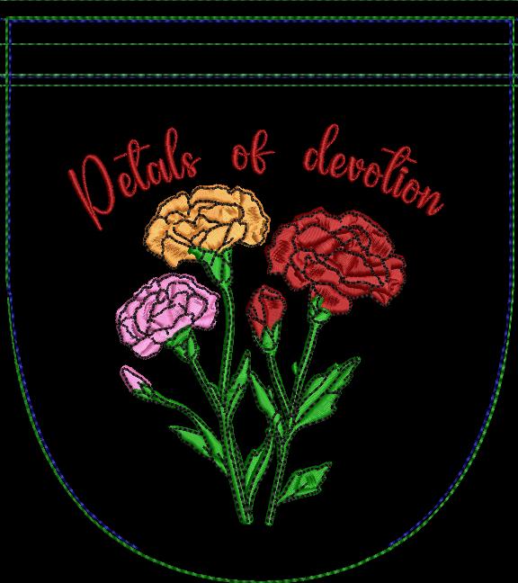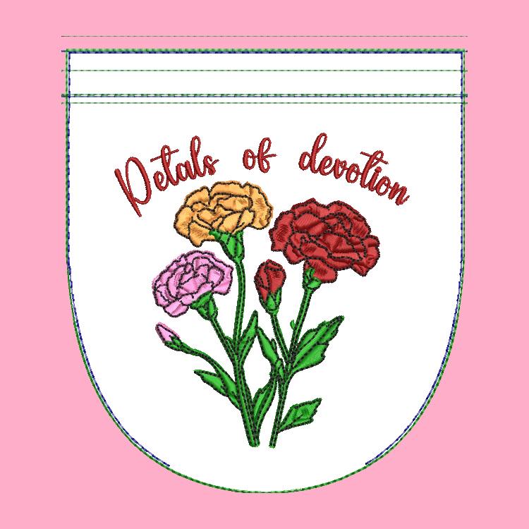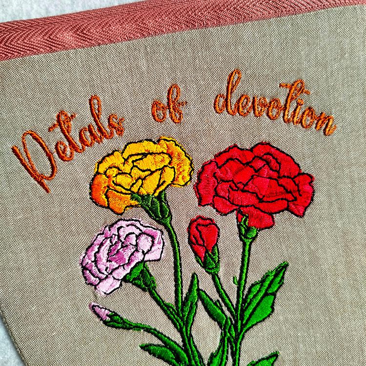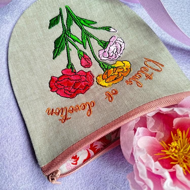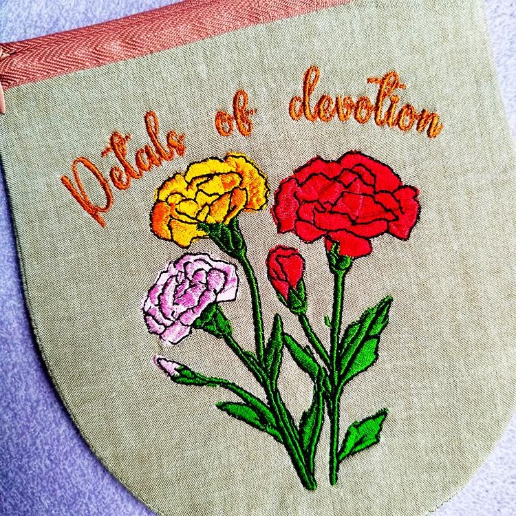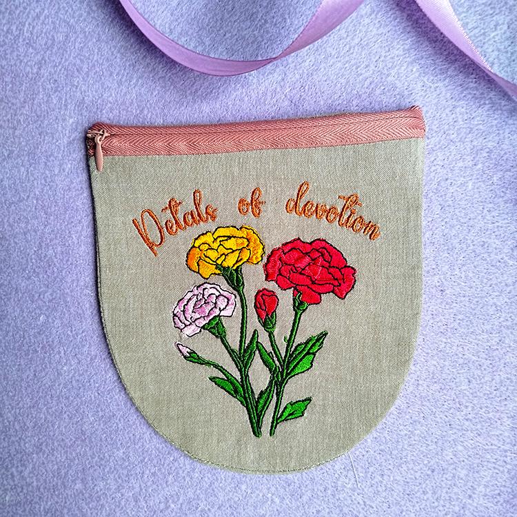 Carnations pretty fully lined purse that is stitched in the hoop with a little handsewing inclusion.