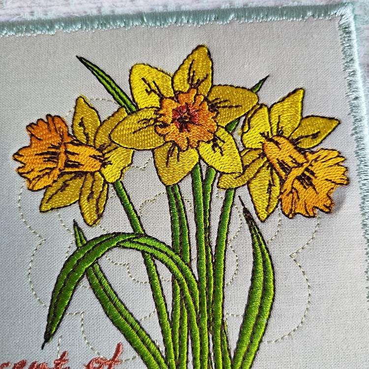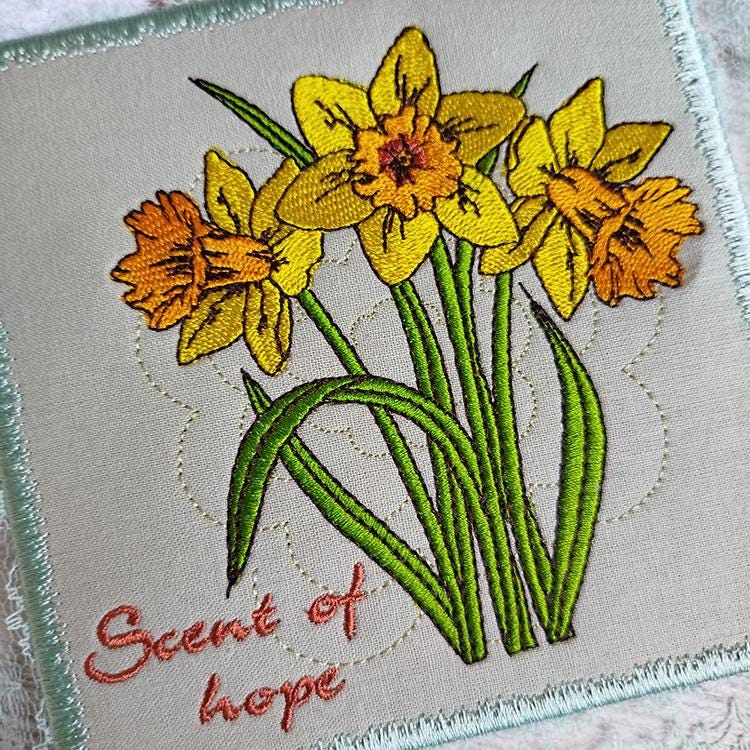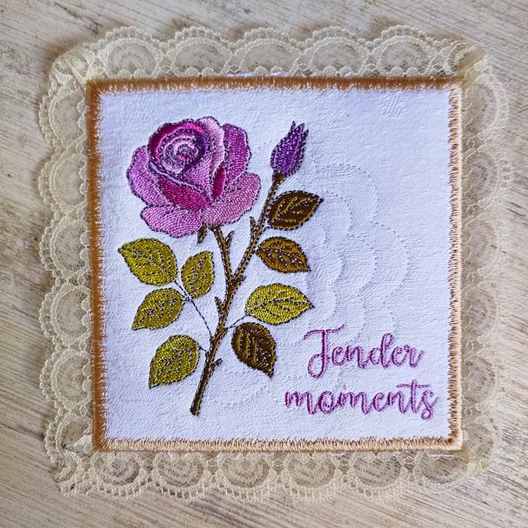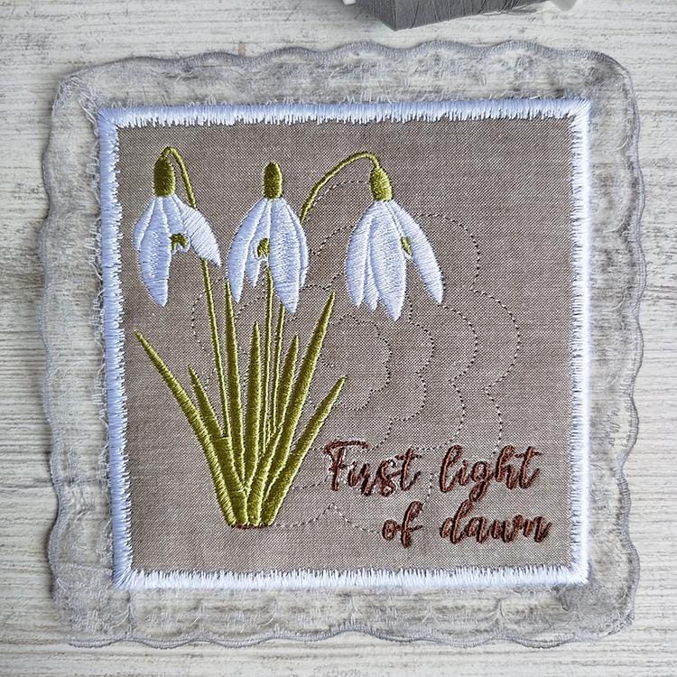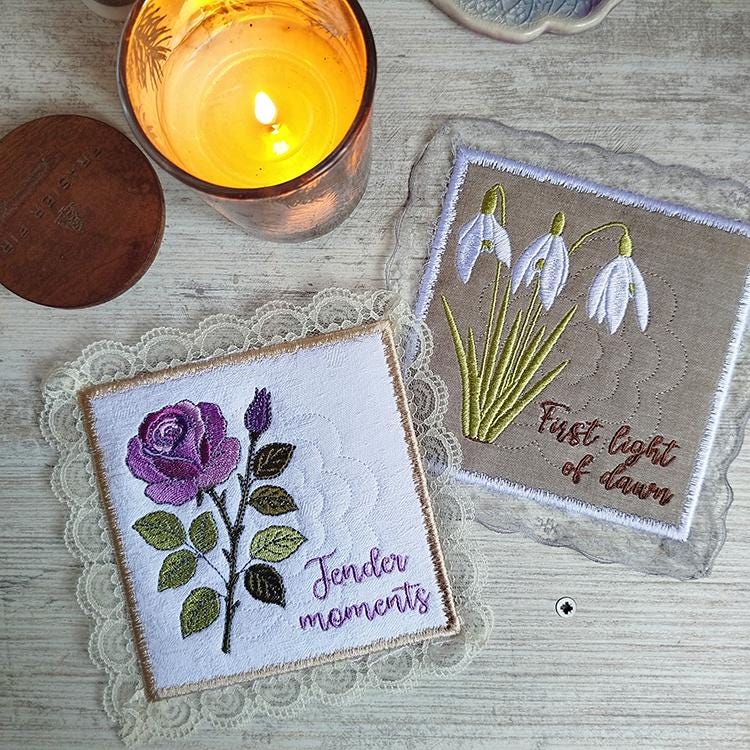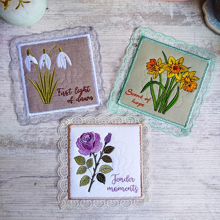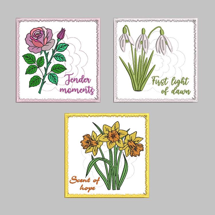 The set includes three designs: rose, snowdrops, daffodils that say "Tender moments," "First light of dawn" and "Scent of hope."