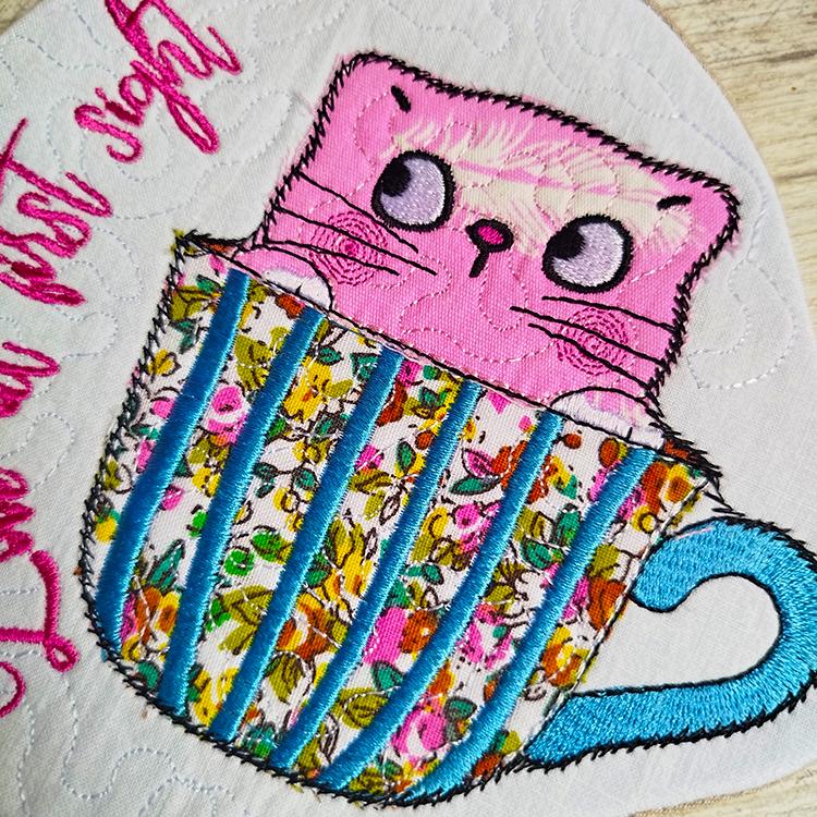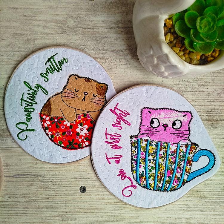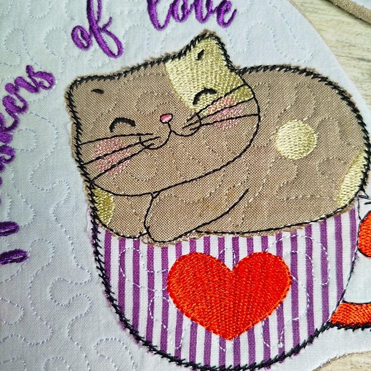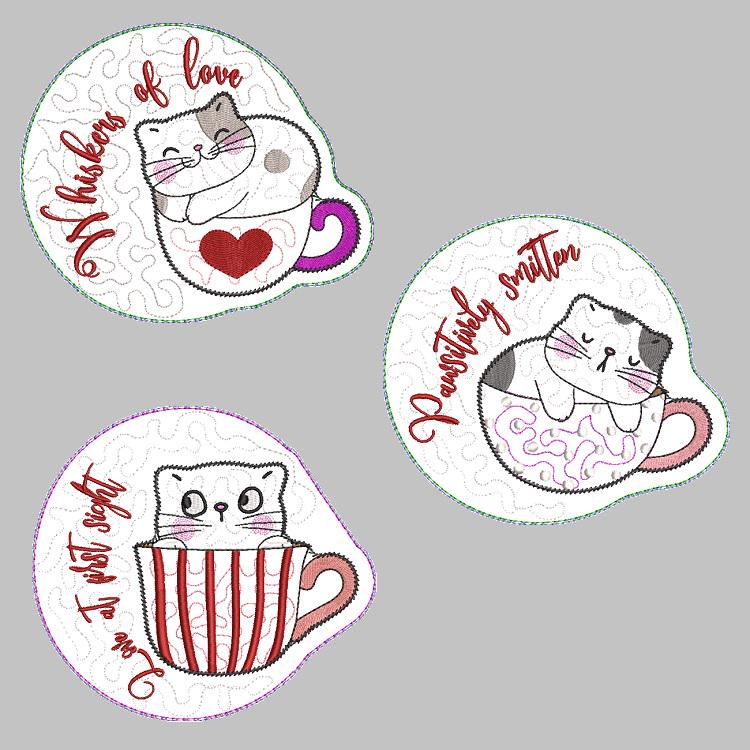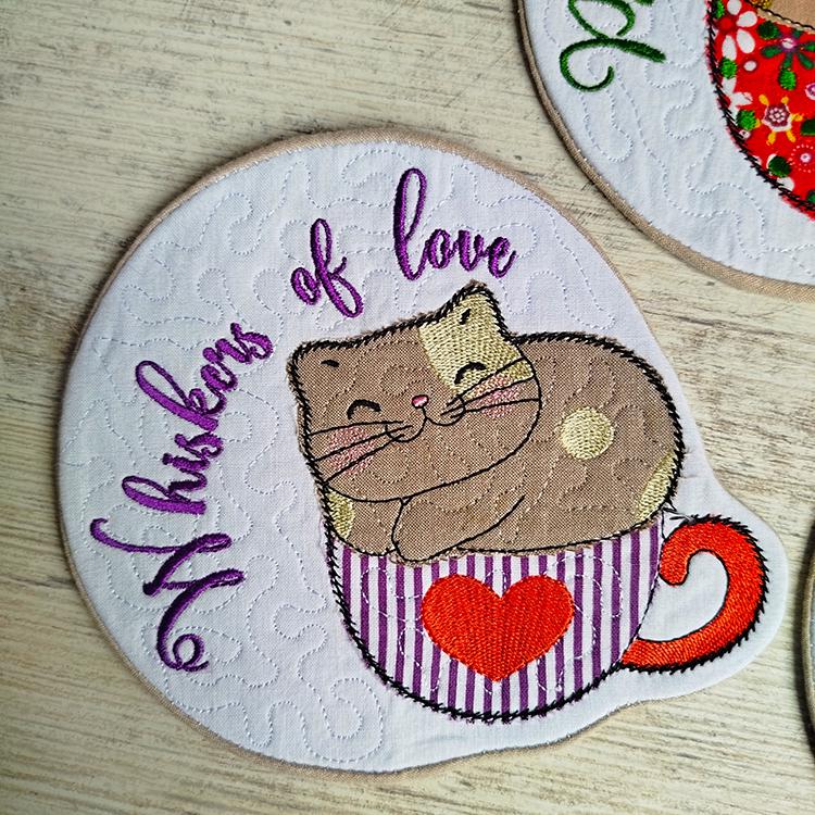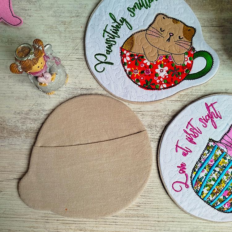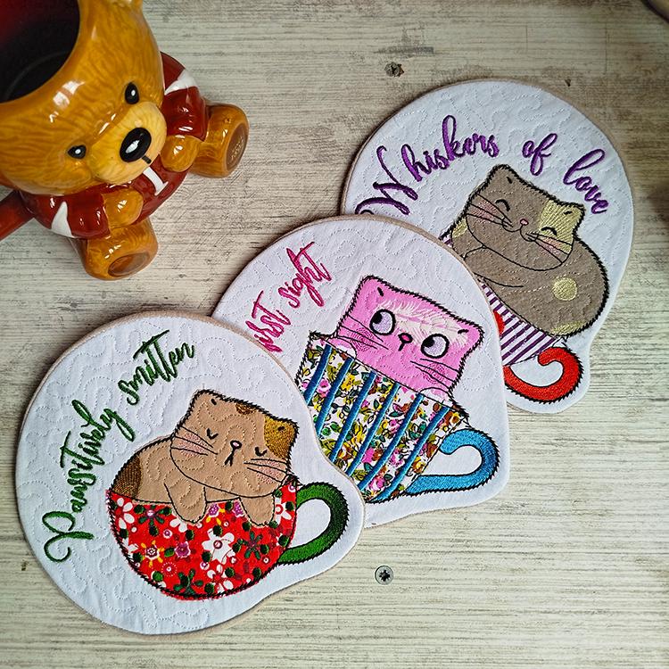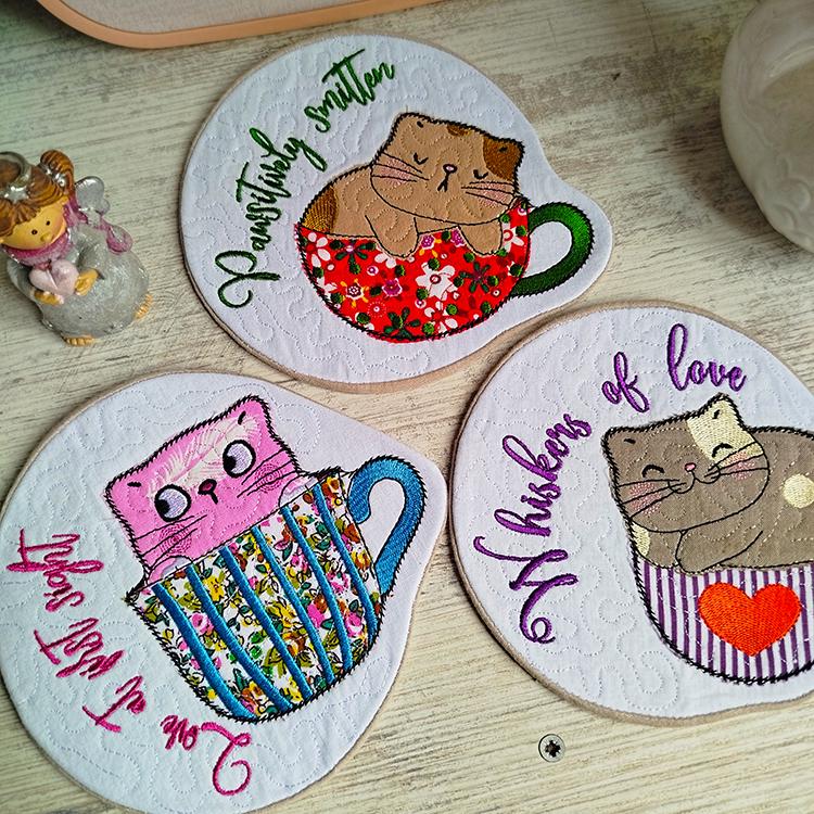 Very cute kittens coasters with the pocket back. They are stitched completely in the hoop.
