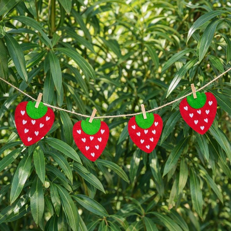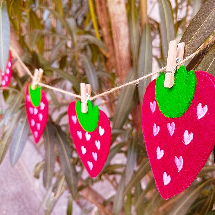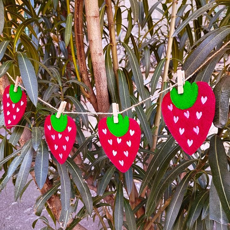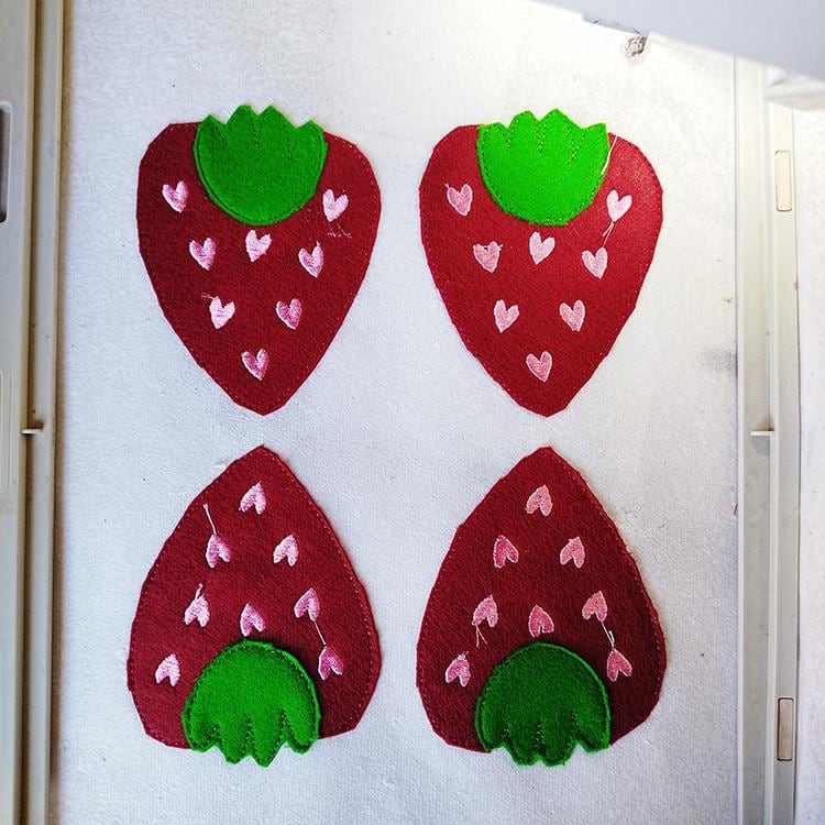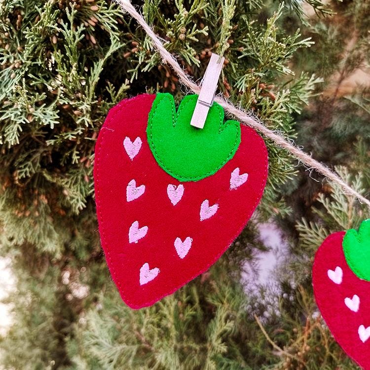 Sweet strawberries garland that is stitched completely in the hoop - all four stitched in one hooping altogether.