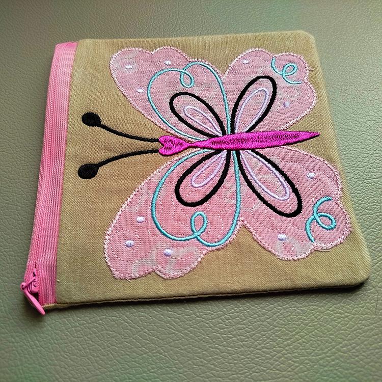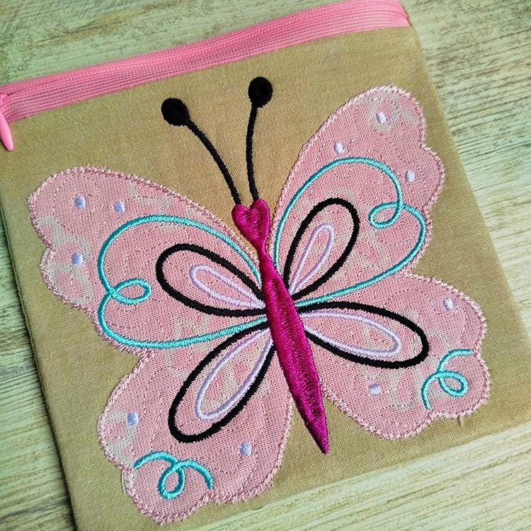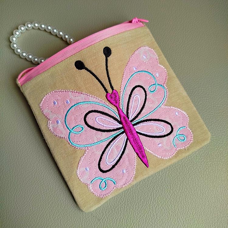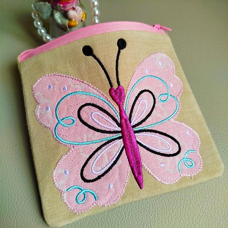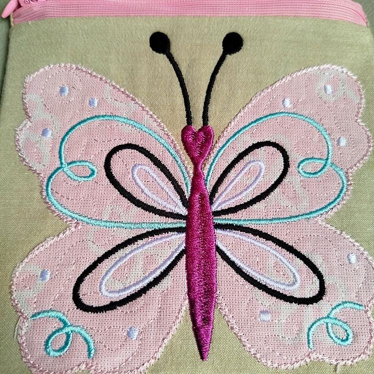 Big butterfly applique fully lined zipper purse that is stitched in the hoop with a little handsewing inclusion.