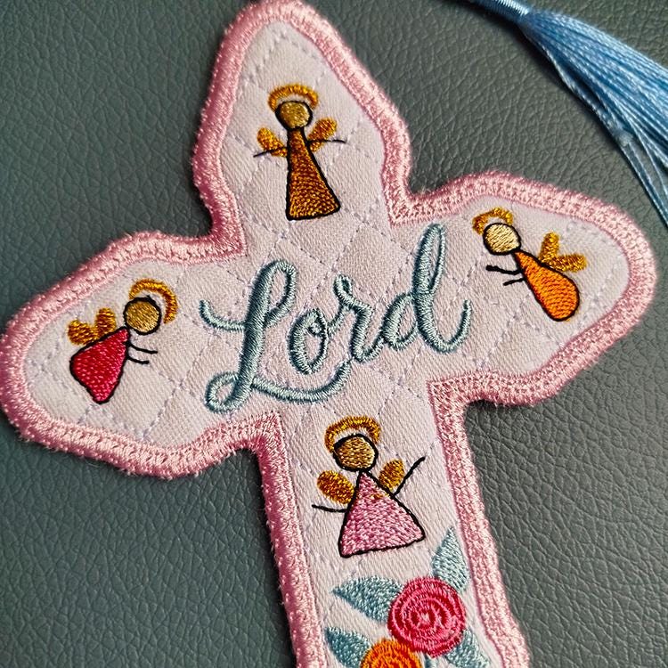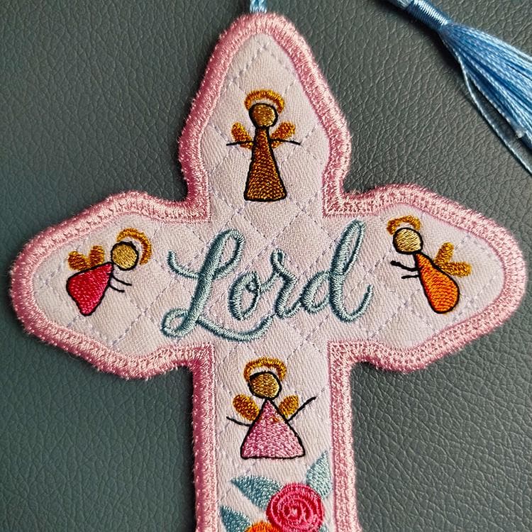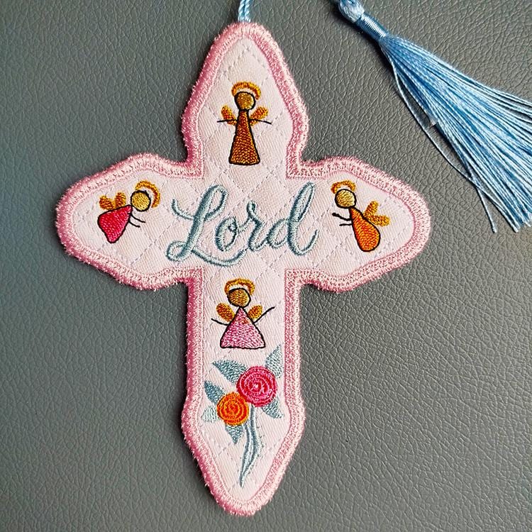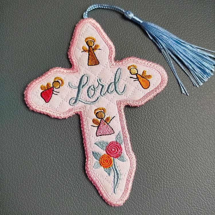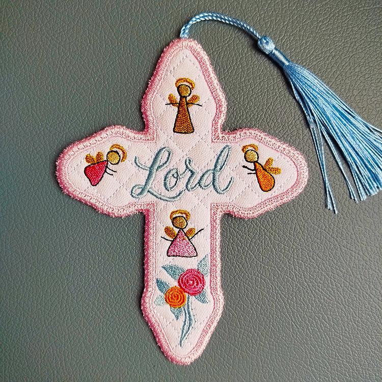 Cross bookmark with angels that says Lord. This bookmark is stitched completely in the hoop.