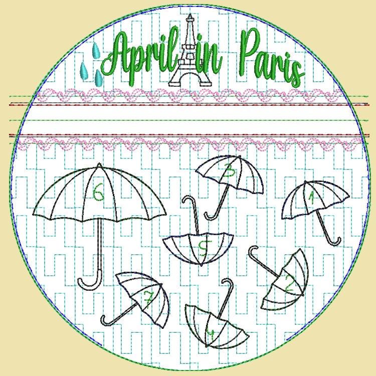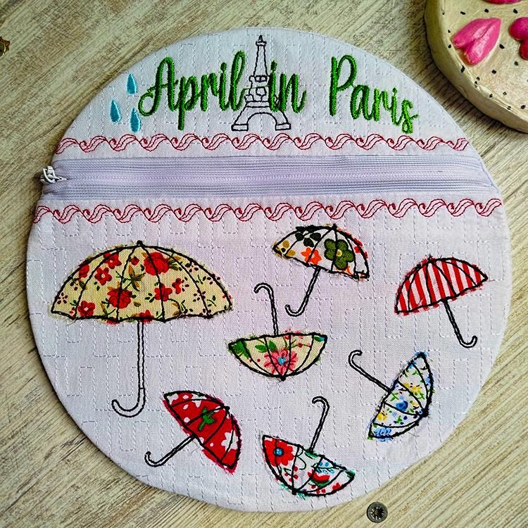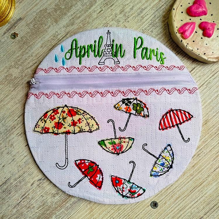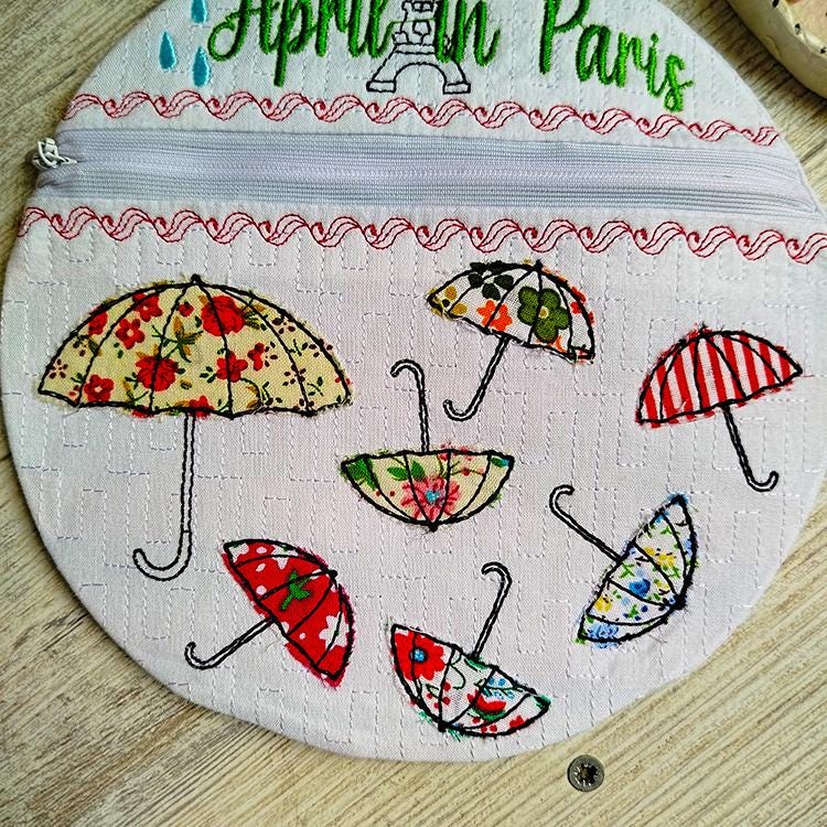 Umbrella appliques fully lined purse that says April in Paris.