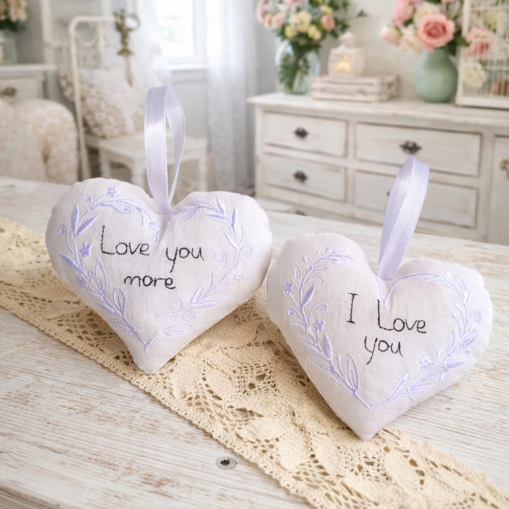 Beautiful in the hoop white on white hearts that are stitched in the hoop with a little handsewing inclusion.