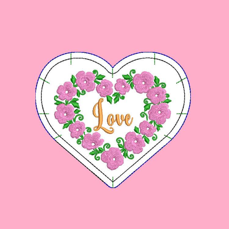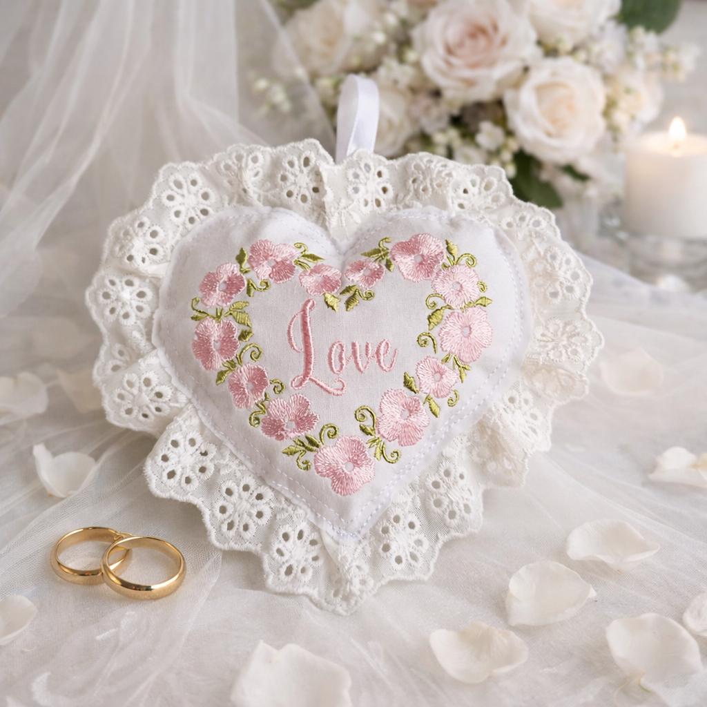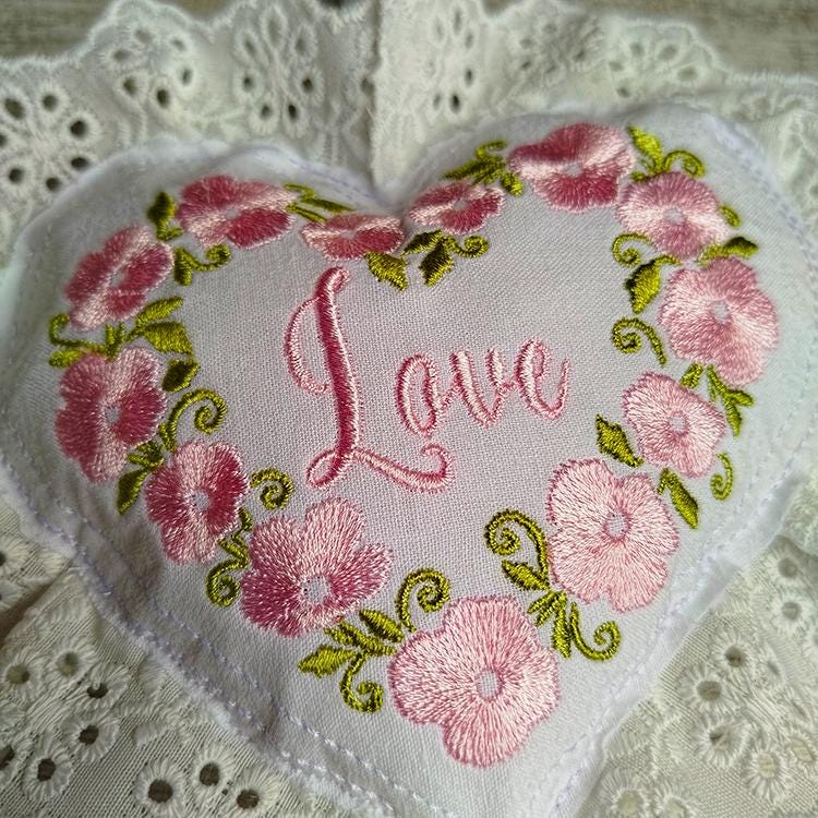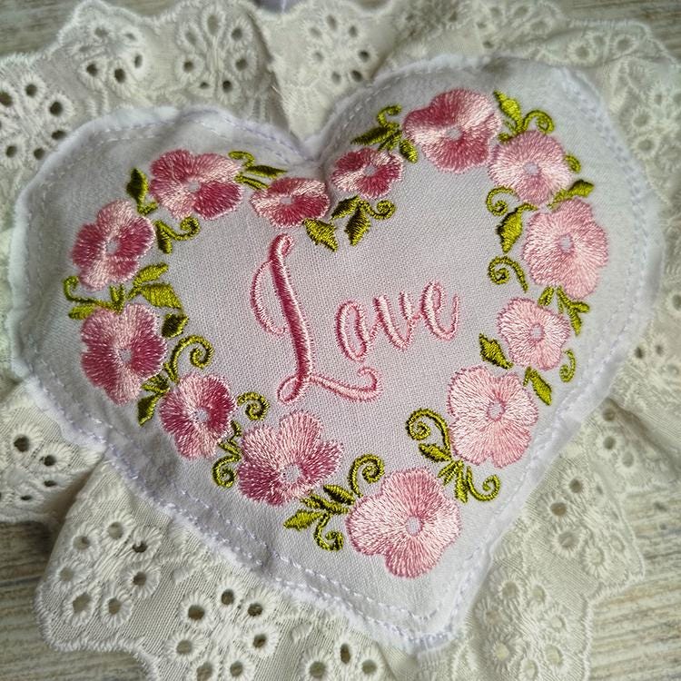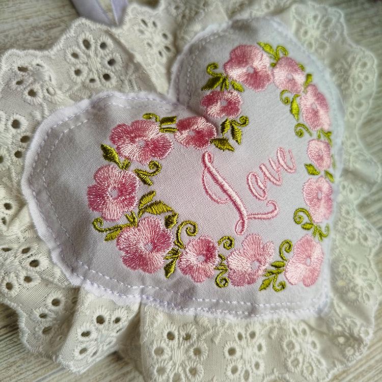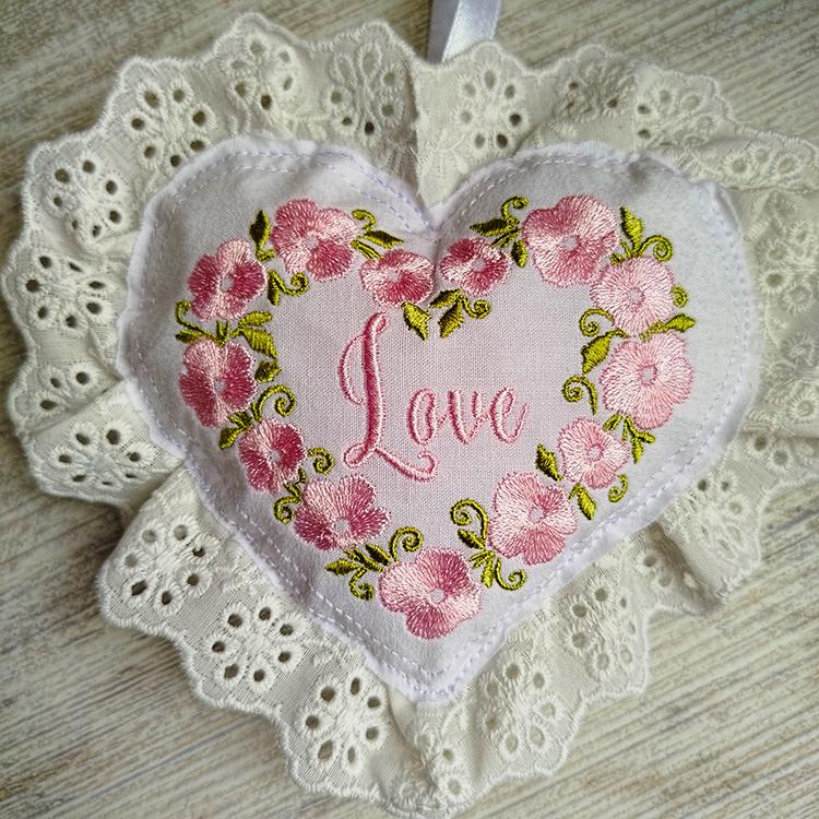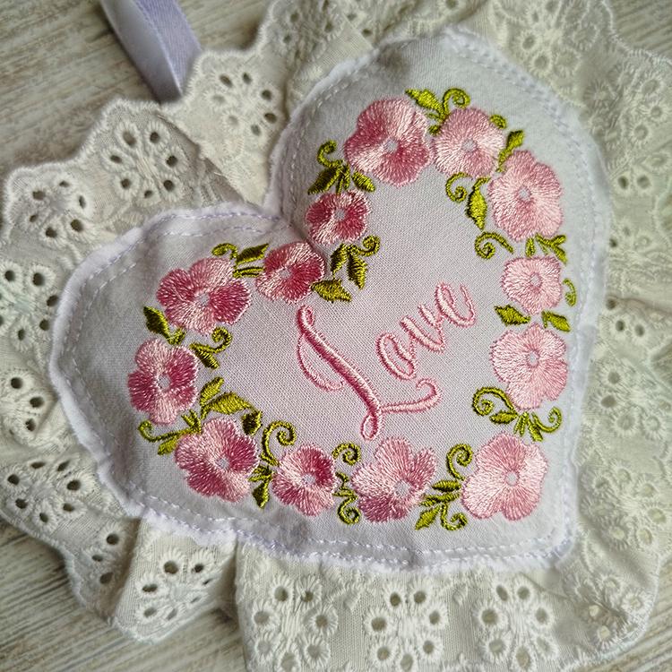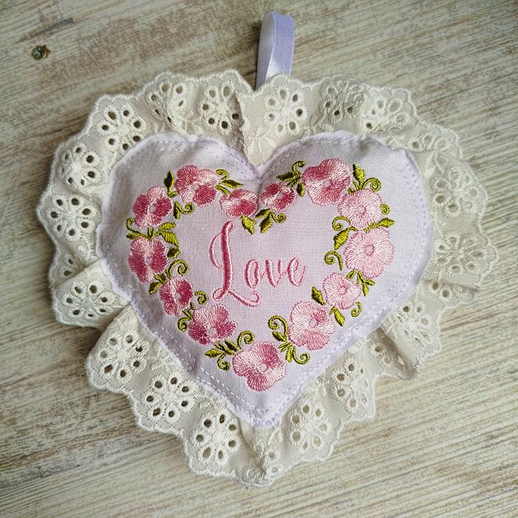 Dainty laces finish floral heart ornament that is done in the hoop with a little handsewing inclusion.