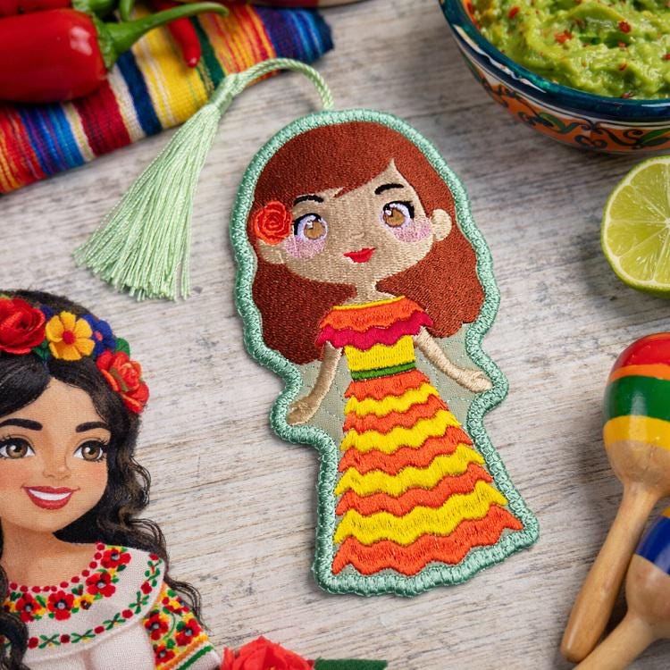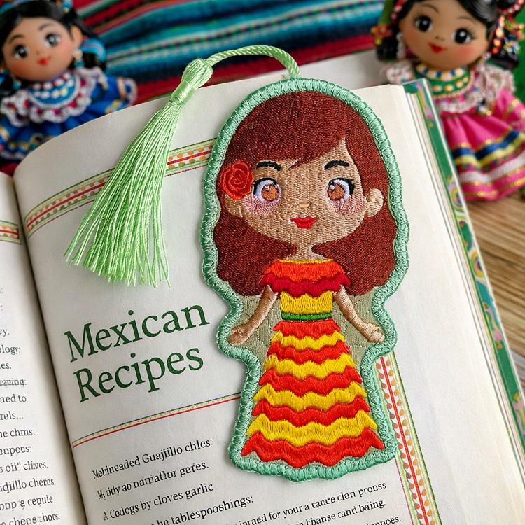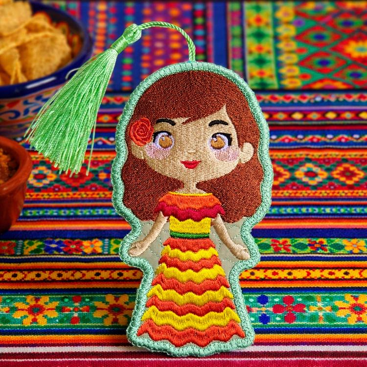 Mexican girl bookmark inspired by Mexican national costumes. This bookmark is made completely in the hoop.