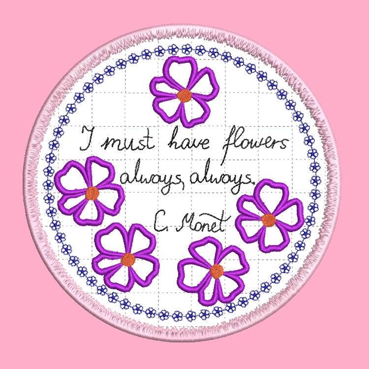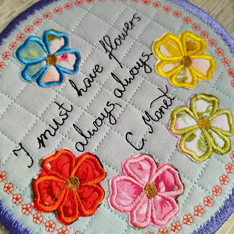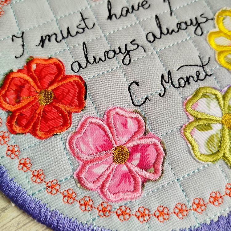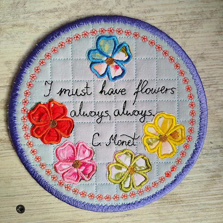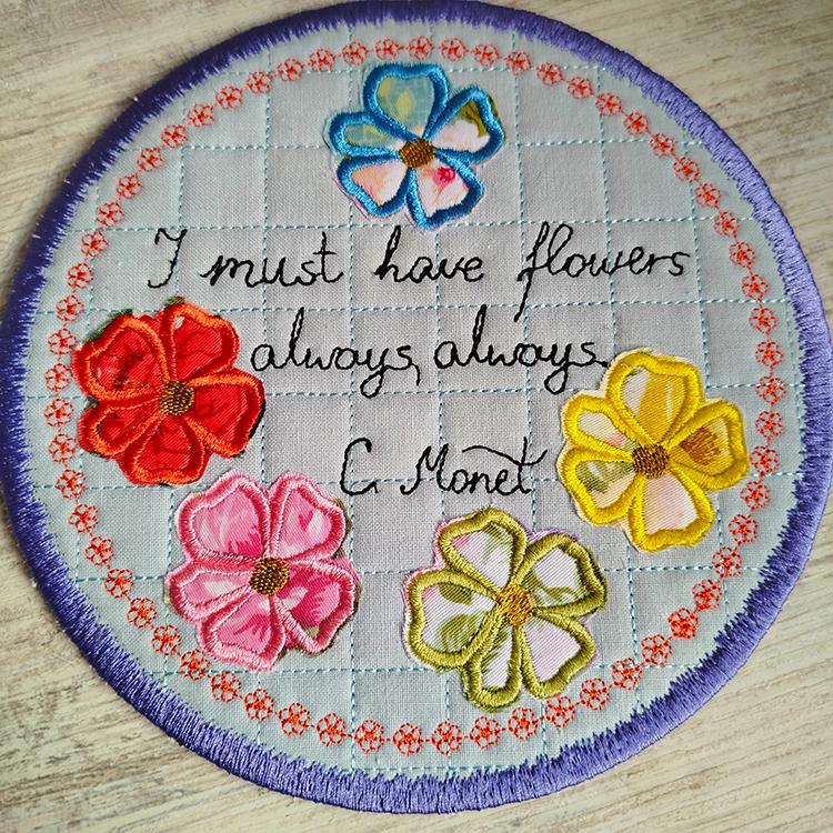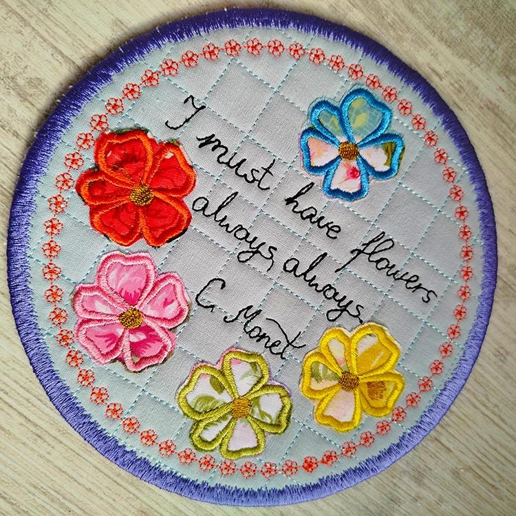 Floral applique coaster with an inspirational saying by the famous impressionist painter C.Monet - done completely in the hoop.