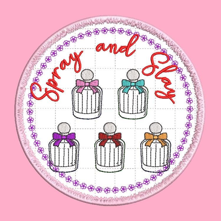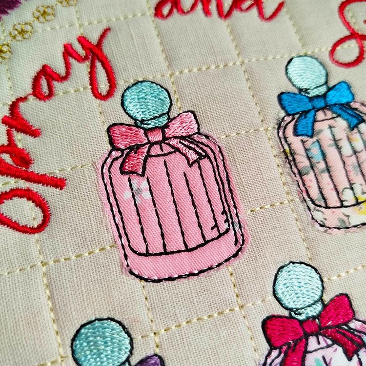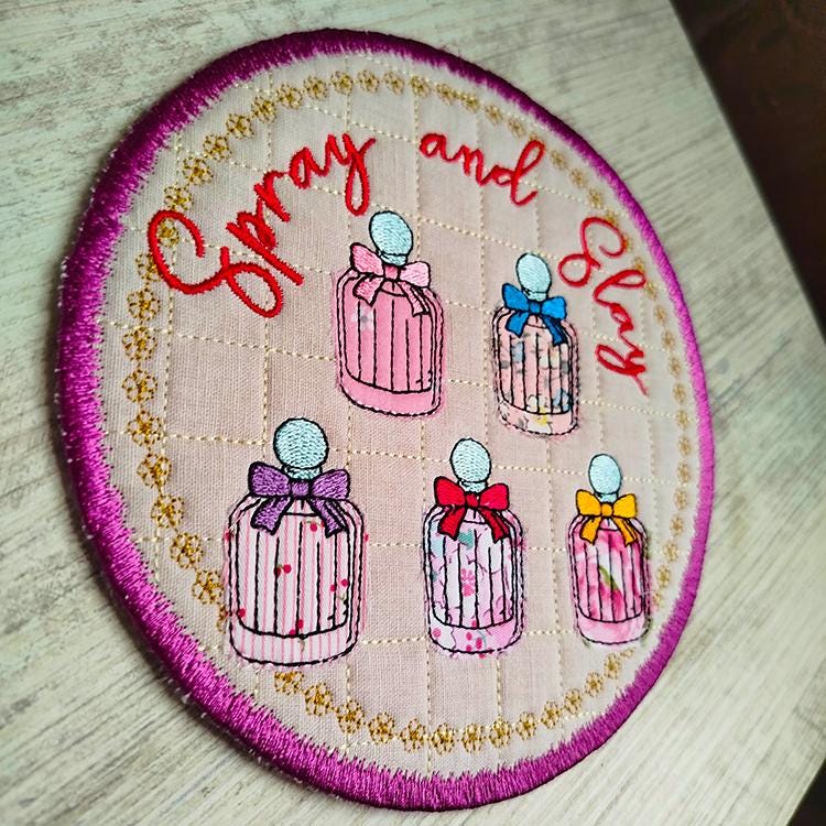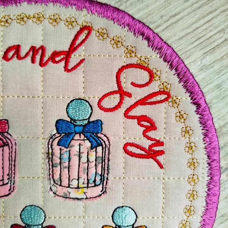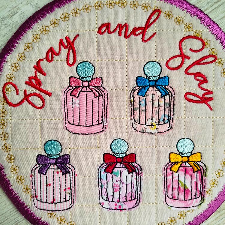 Beautiful perfume applique coaster that is stitched completely in the hoop.