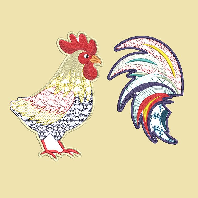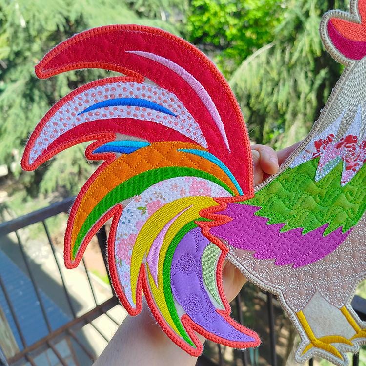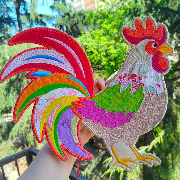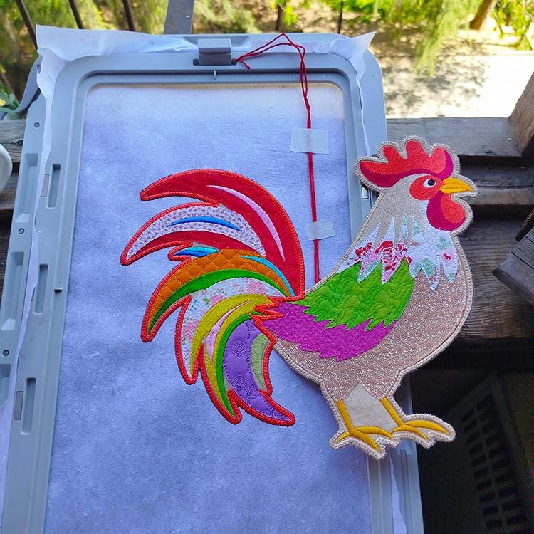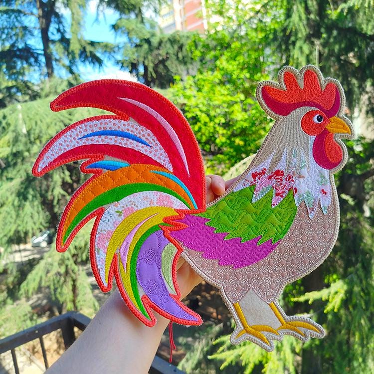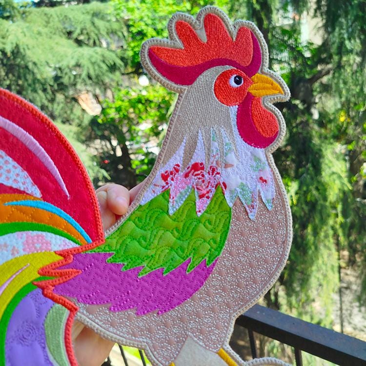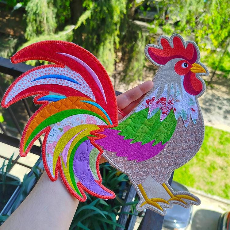 Huge and colorful rooster Gregory that is made in two hoopings and completely in the hoop.