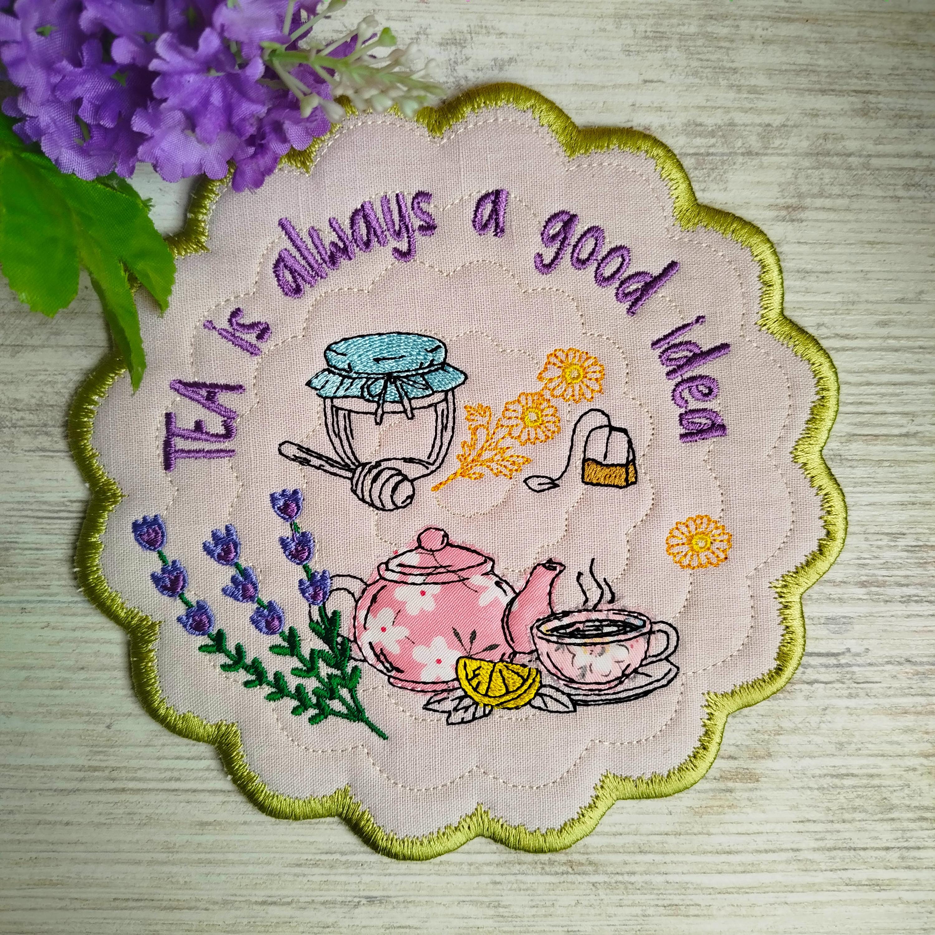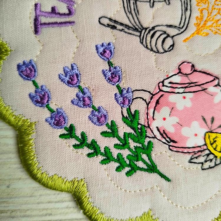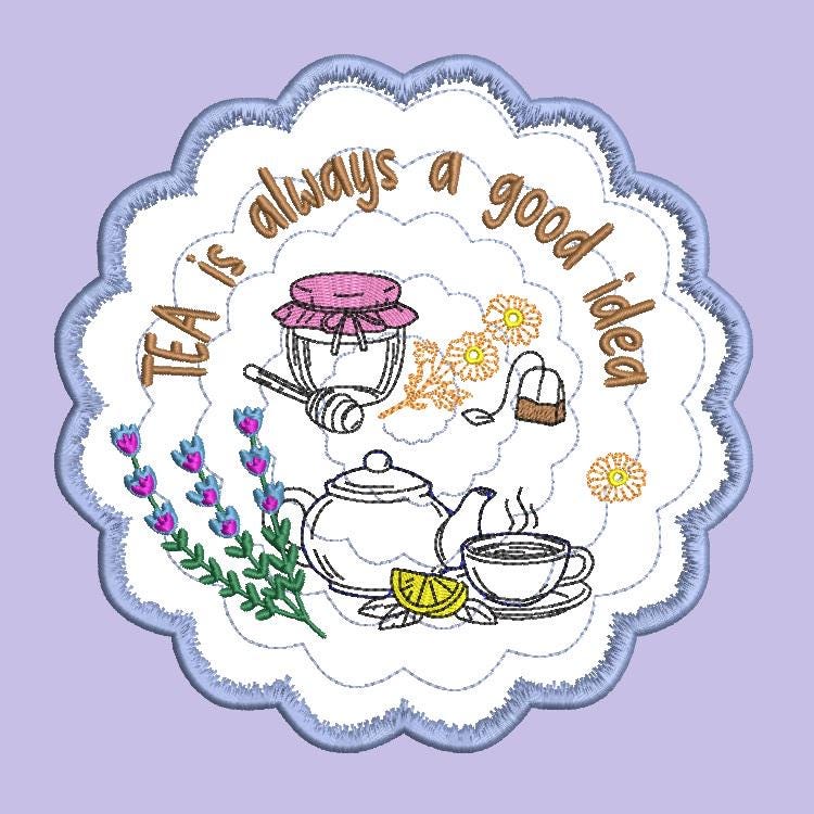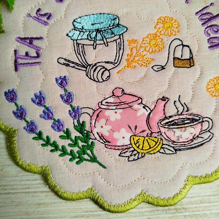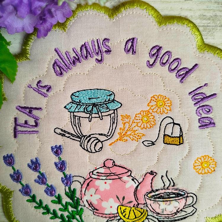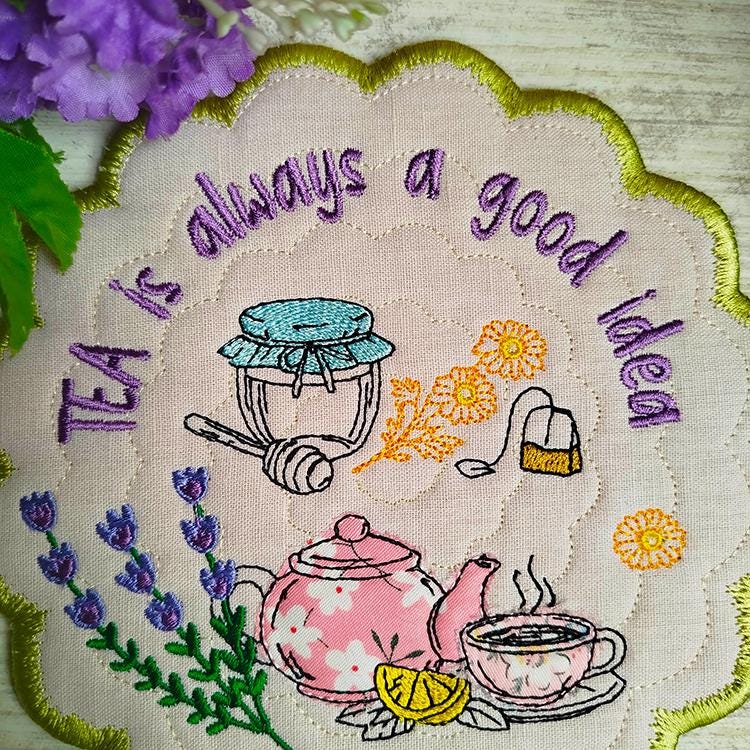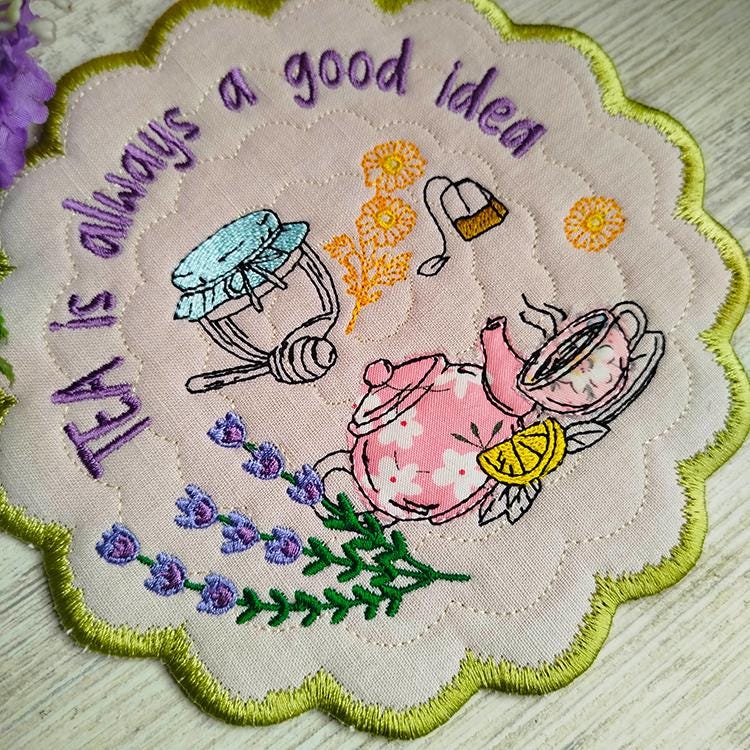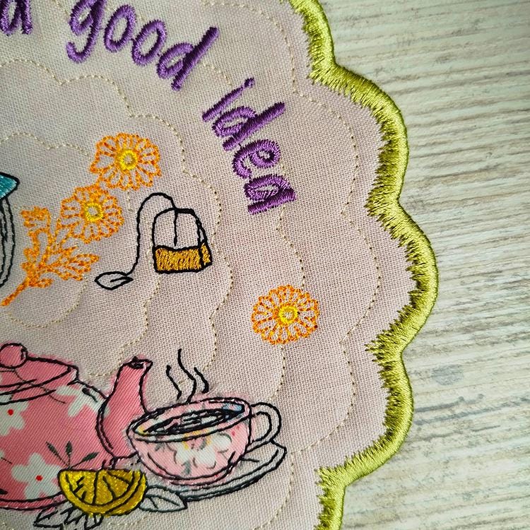 Tea topic applique coaster that is made completely in the hoop.