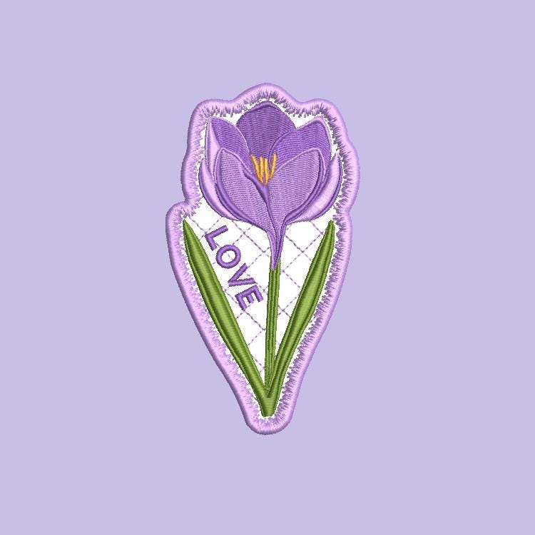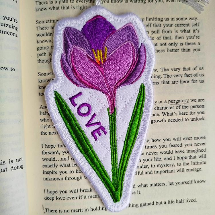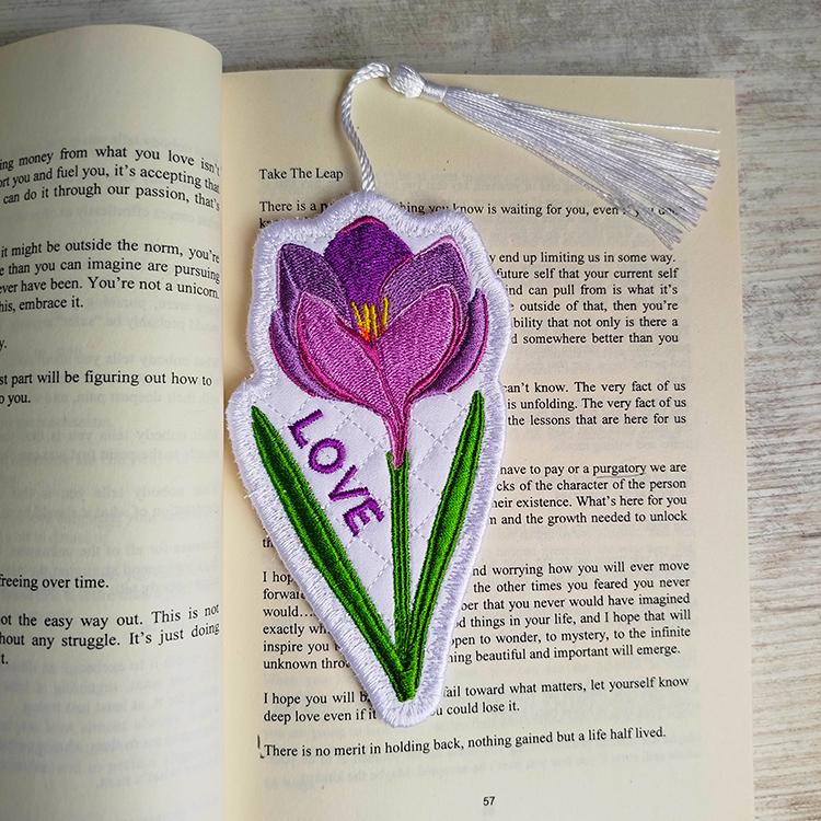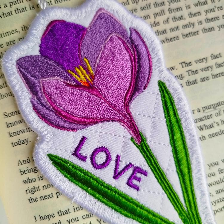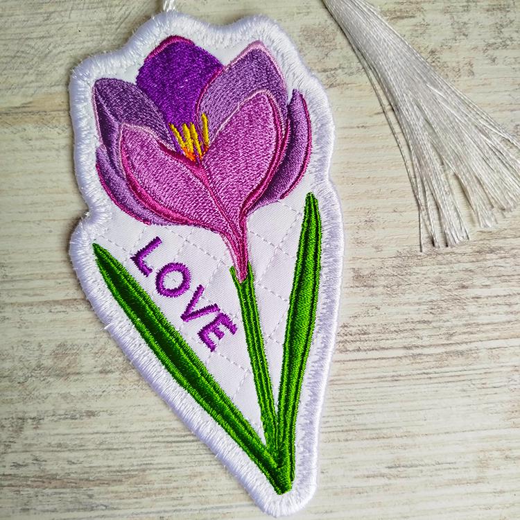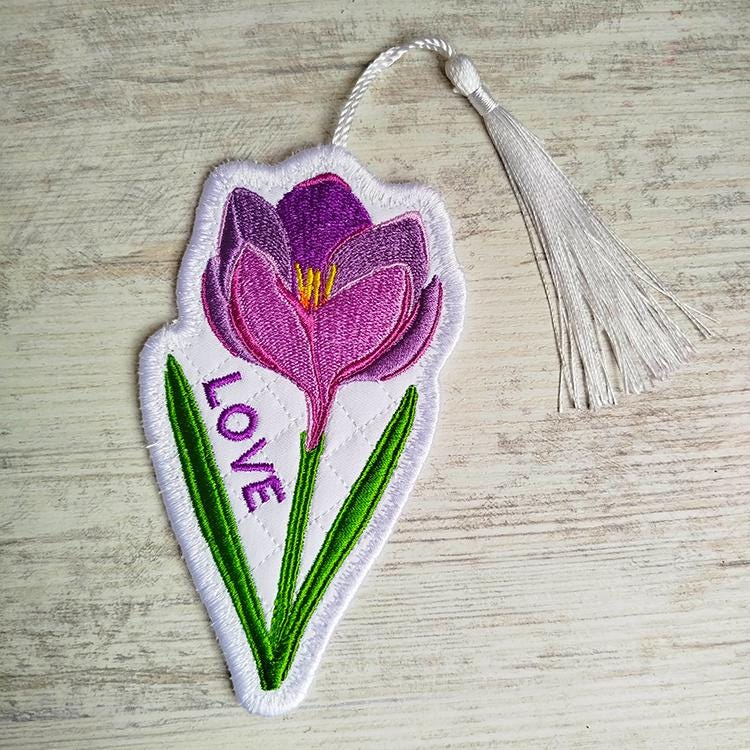 Crocus flower bookmark that is stitched completely in the hoop.