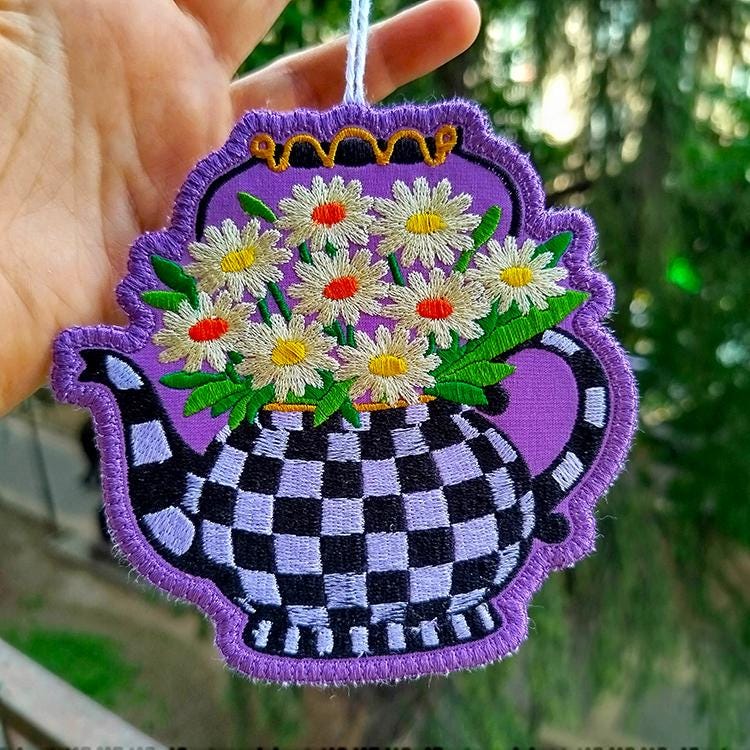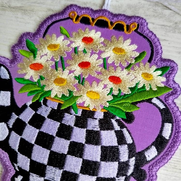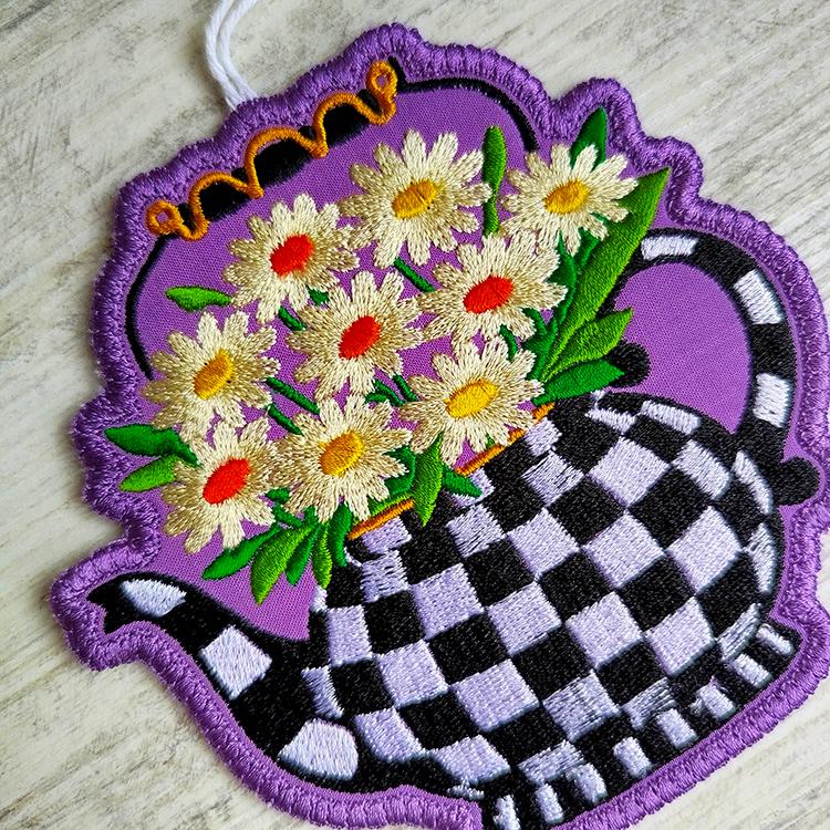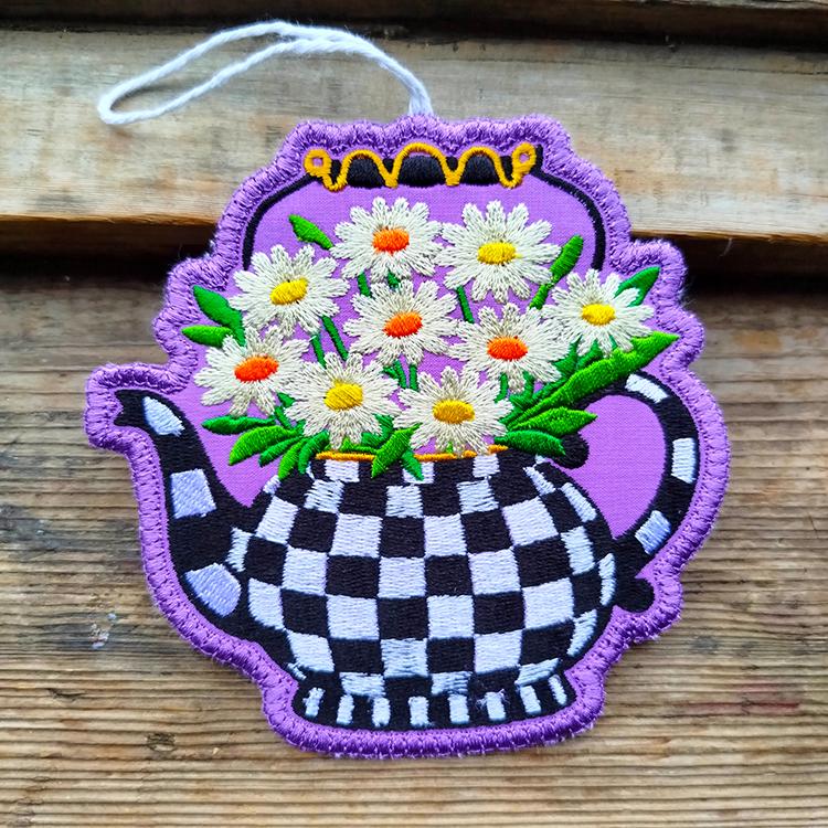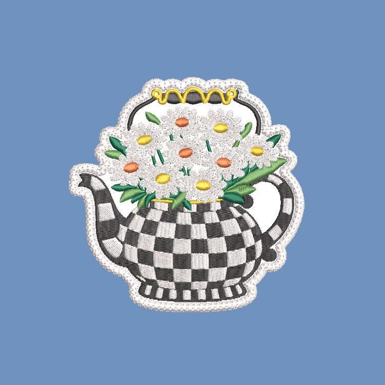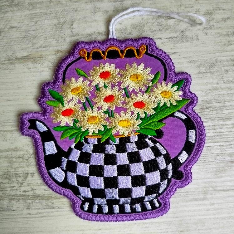 Checkered teapot with daises ornament that is made completely in the hoop.