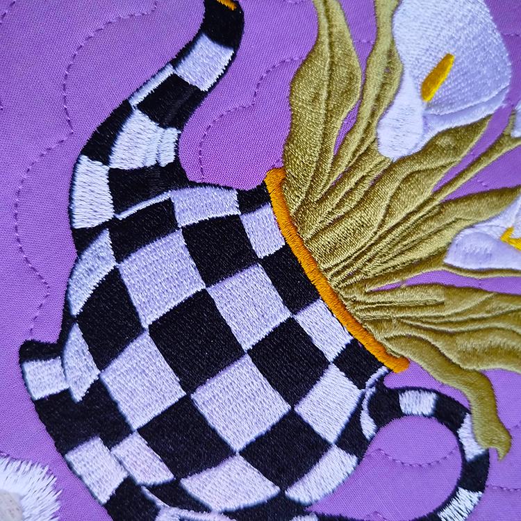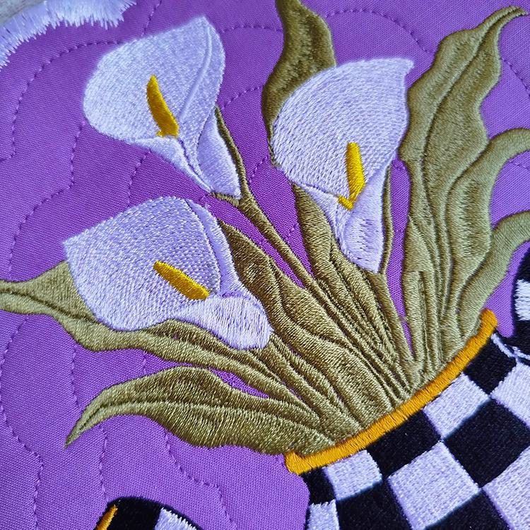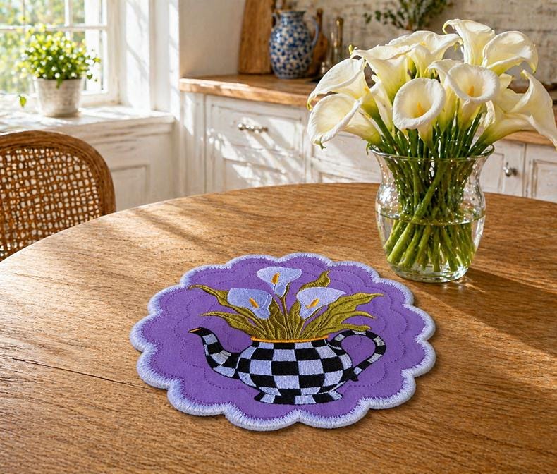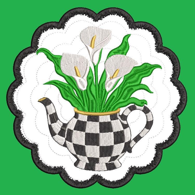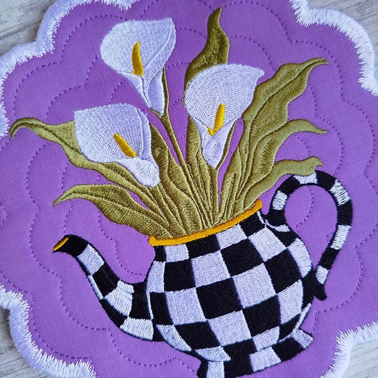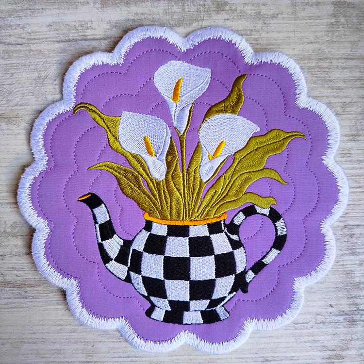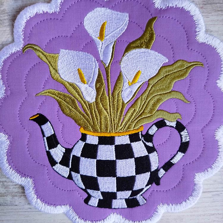 Beautiful checkered teapot coaster with Calla lillies - made completely in the hoop.